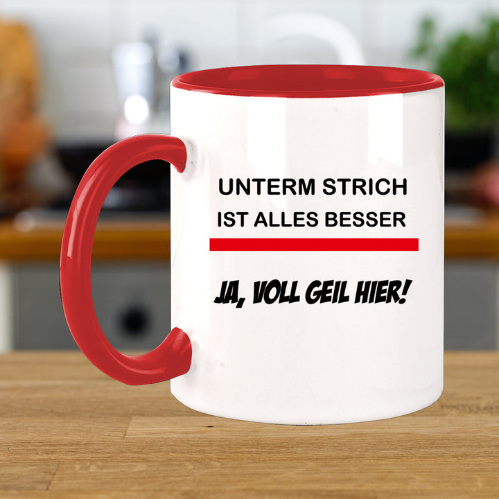 FUNNYWORDS® Rote Streifen Serie UNTERM STRICH IST ALLES BESSER Kaffeebecher