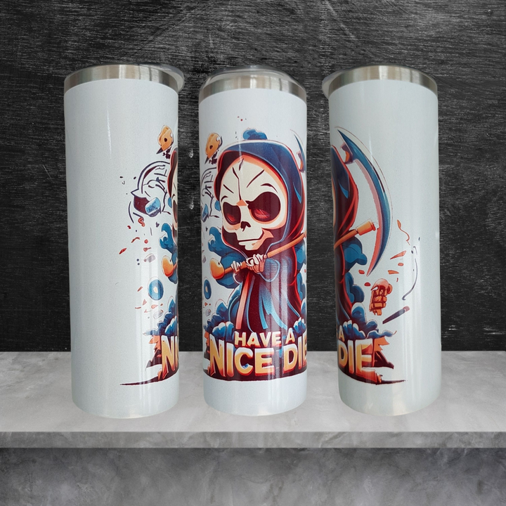 Der Sensenmann "Have a Nice Die" Thermobecher kombiniert dunklen Humor mit einem farbenfrohen Design, das in jedem Moment für ein Schmunzeln sorgt. Ob du deinen morgendlichen Kaffee, Tee am Nachmittag oder kühle Getränke unterwegs genießt, dieser Tumbler wird dir stets ein Lächeln ins Gesicht zaubern.