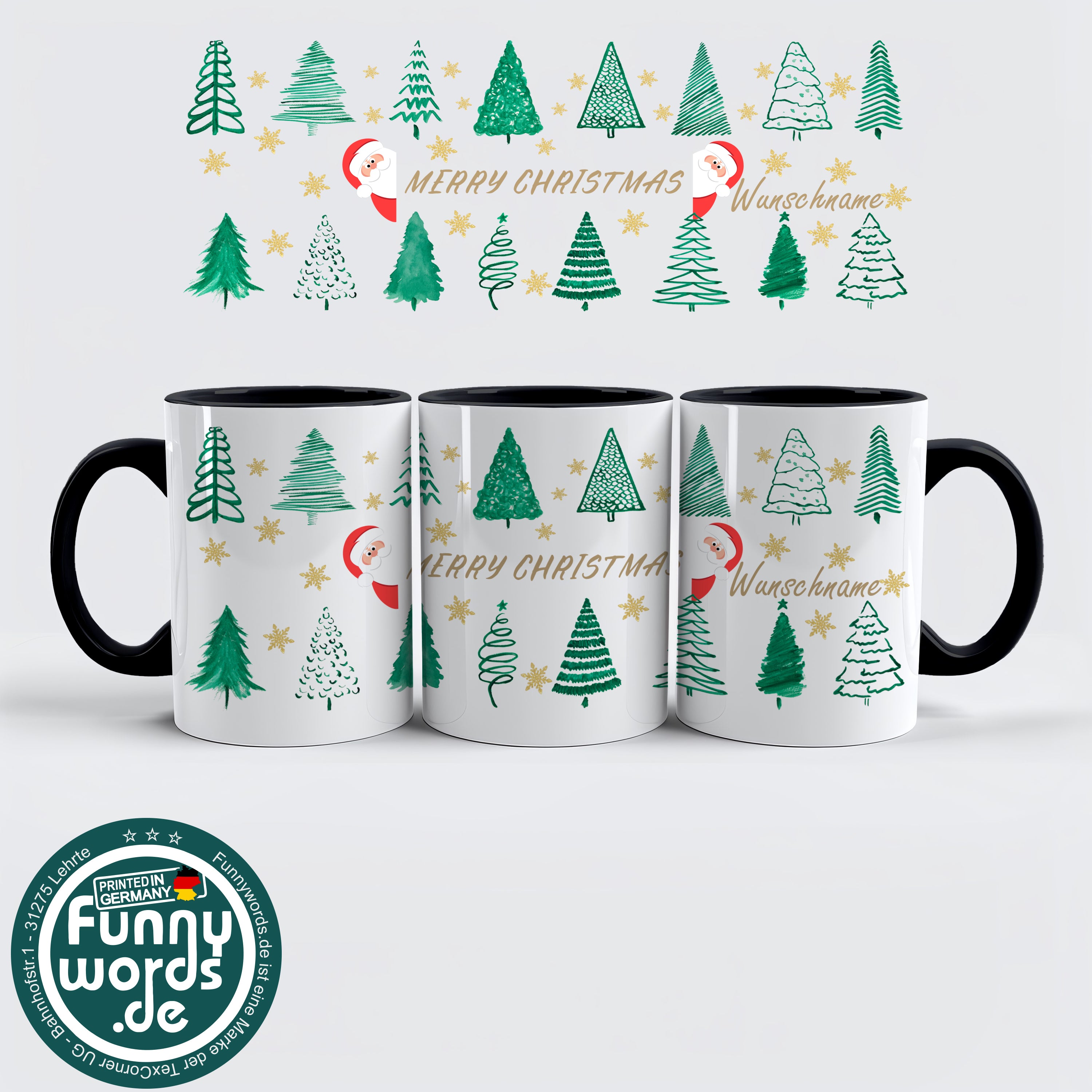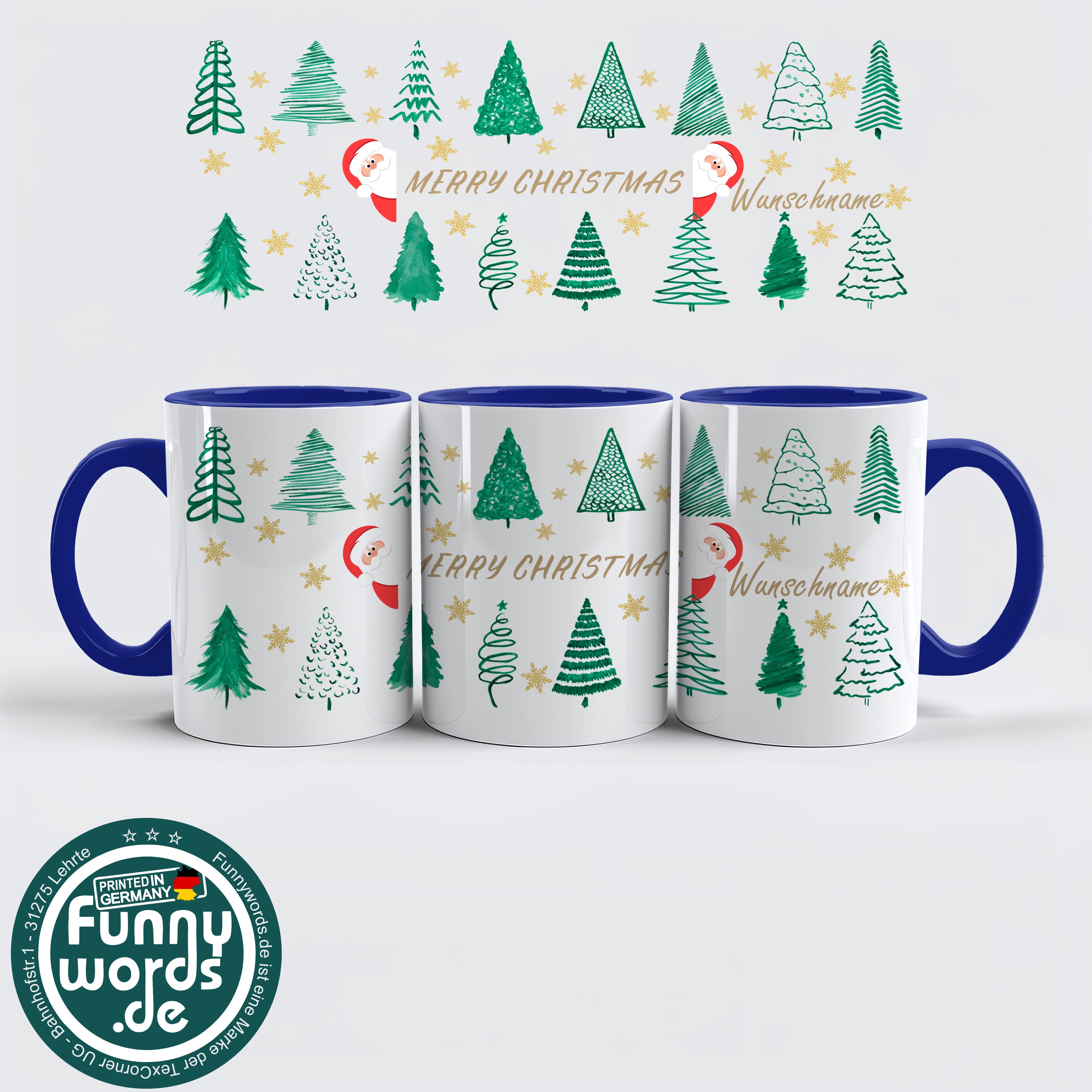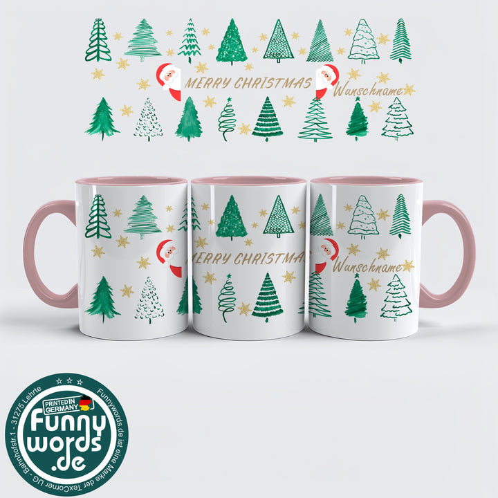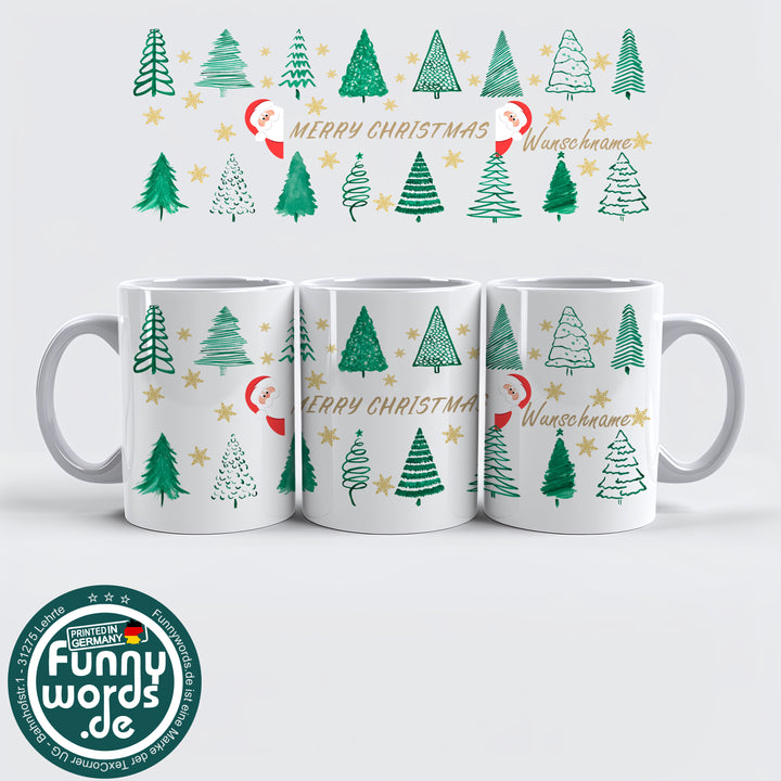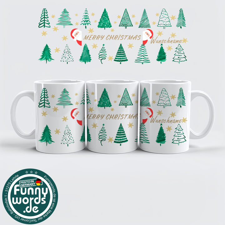 Merry Christmas Tasse – Weihnachtsbäume & Goldsterne Style – personalisierbar