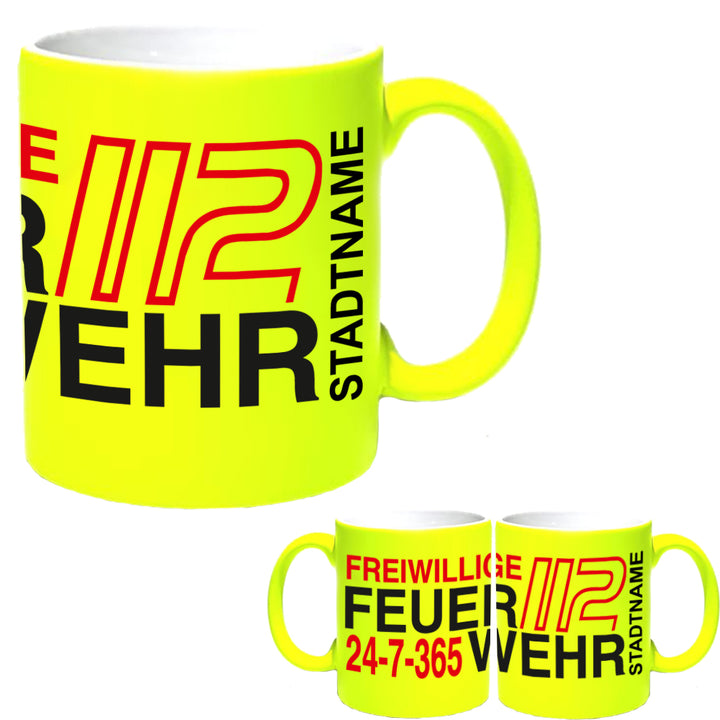 Neongelbe Freiwillige Feuerwehr Tasse FW2000 inkl. Wunschtext
